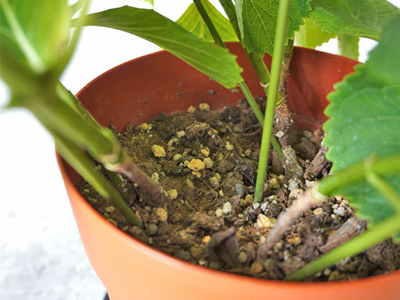 アジサイの鉢購入した年は、剪定後に植え替えを行います。