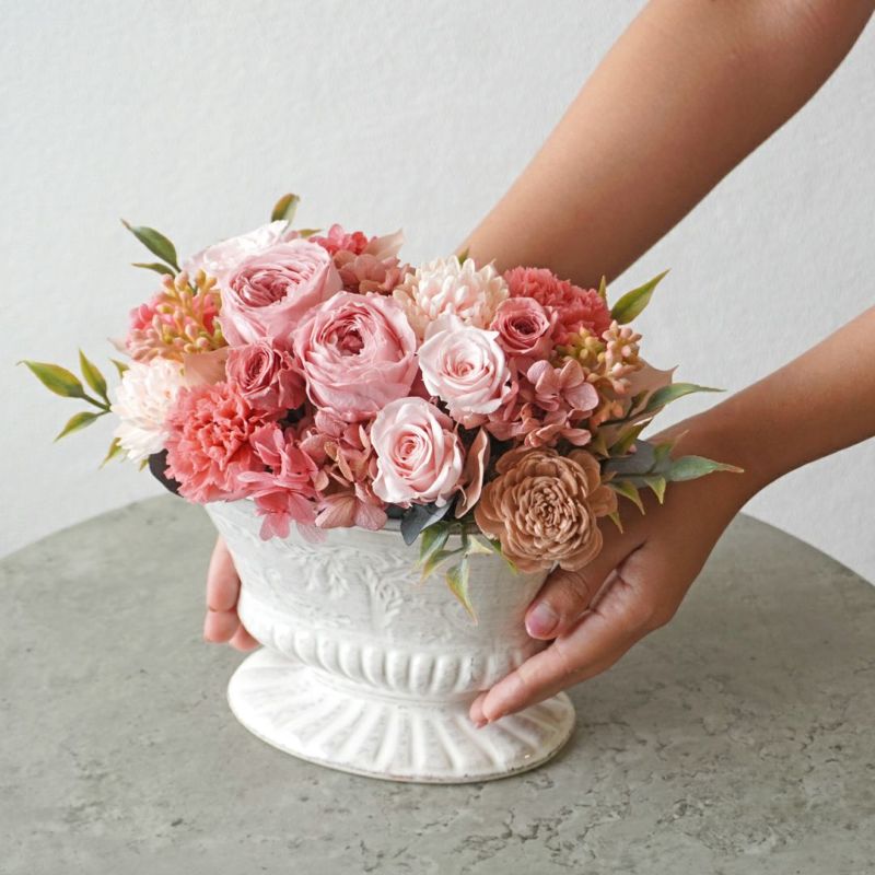 水なしで生花のような風合いを長くお楽しみいただける、人気のプリザーブドフラワーです。白い陶製の器いっぱいのプリザーブドのバラやカーネーション。落ち着きのあるピンクのバリエーションで彩り良くまとめました。