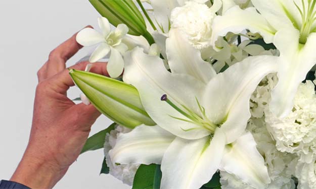 必要に応じて、電話もしくはメールでさらに詳細な情報を伺い、お悔みのシーンにふさわしい花を手配いたします。